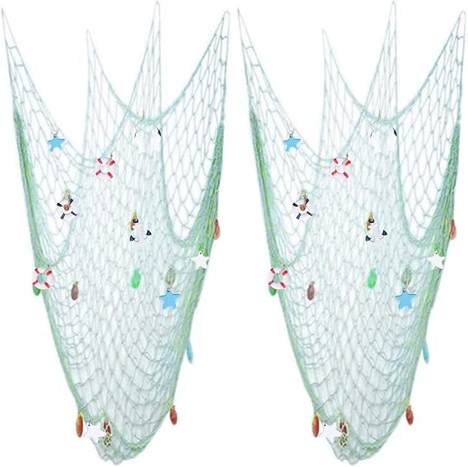 Nature Fish Net Wall Decoration with Shells, Ocean Themed Wall Hangings Fishing Net Party Decor for Pirate Party,Wedding,Photographing Decoration (2pack-Aqua/Aqua) -
