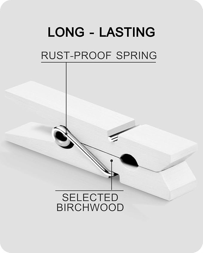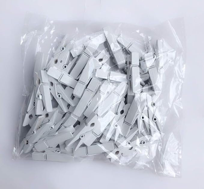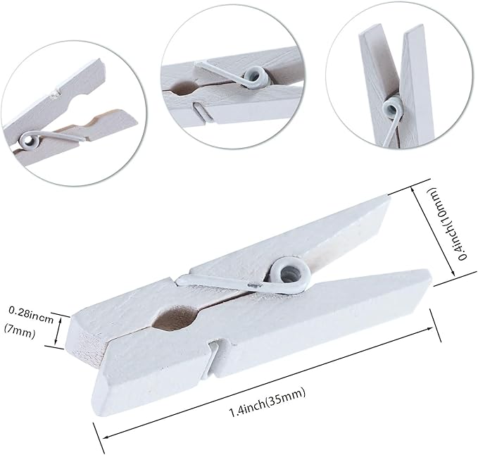 100Pcs White Mini Wooden Clothespins with 328ft Jute Twine - Photo Display Clips for Hanging Pictures, Crafts, Wall Art, Baby Showers (1.4 Inch, White) -