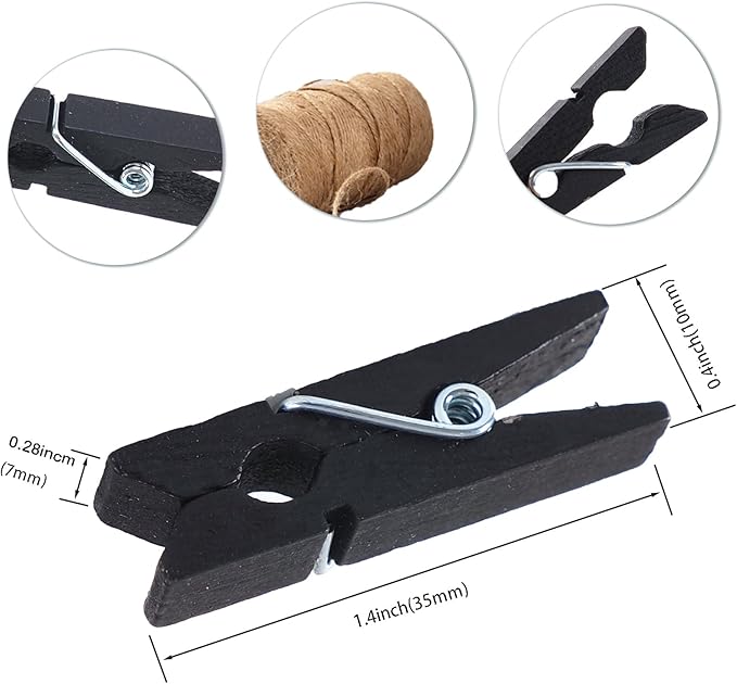 100Pcs Black Clothespins with String, 1.4Inch Wooden Clothes Pins with 328Ft Jute Twine, Mini Photo Display Clips, Black Clips for Hanging Photo, DIY Crafts,Wall Art, Baby Shower -