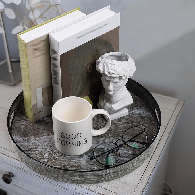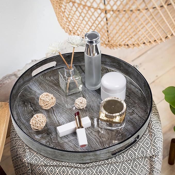 MAONAME 13" Gray Round Tray, Grey Serving Tray with Handles, Modern Round Decorative Trays for Coffee Table, Plastic Trays for Ottoman, Bathroom, Decor -