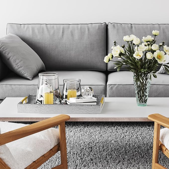17" x 12" Wood Serving Tray with Gold Polished Metal Handles, Home Decorative Wooden Rectangle Ottoman Leather Decor Platter Bathroom Vanity Tray for All Occasions Alligator Silvery -