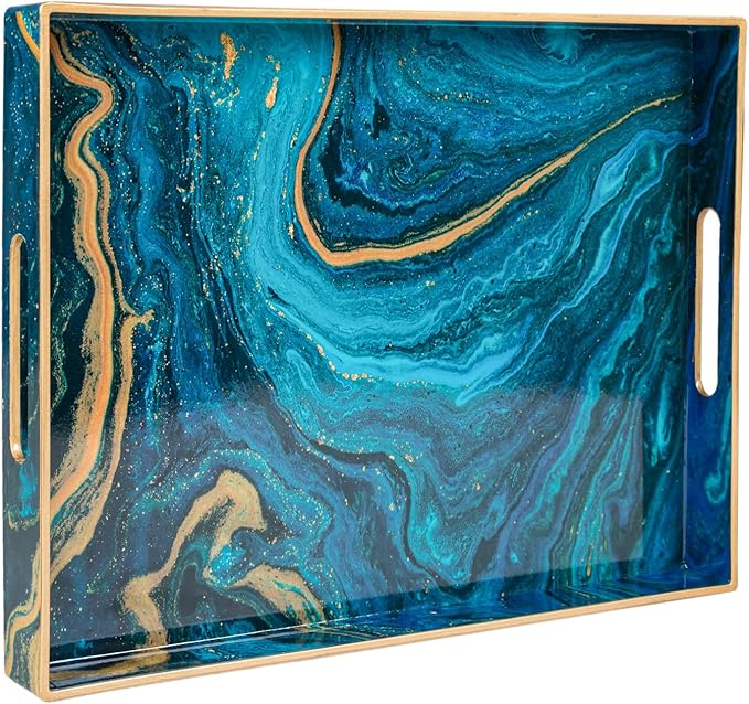 MAONAME Plastic Decorative Tray, Marbling Tray with Handles, Rectangular Coffee Table Trays, Blue Serving Trays for Ottoman, Bathroom, 15.7” x 11.8” -