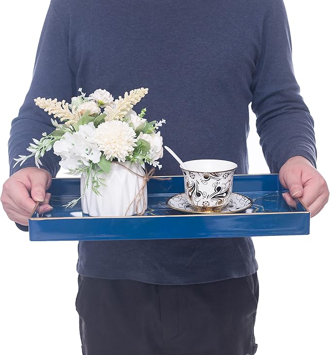 MAONAME Navy Blue Serving Tray with Handles, Modern Decorative Tray for Coffee Table, Plastic Rectangular Tray for Ottoman, Bathroom, Decor, 15.8” x 10.2” x1.4 -