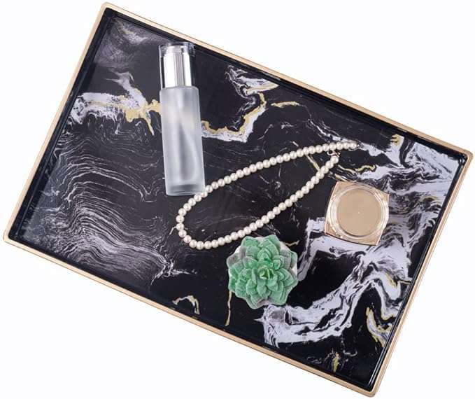 MAONAME Decorative Tray, Plastic Marbling Tray with Handles, Rectangular Coffee Table Trays for Ottoman, Bathroom, 15.7” x 10.2”, Black -