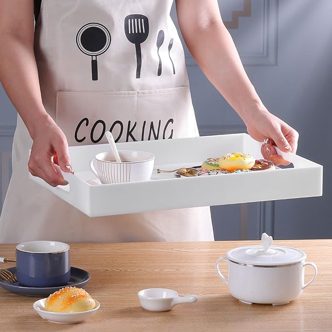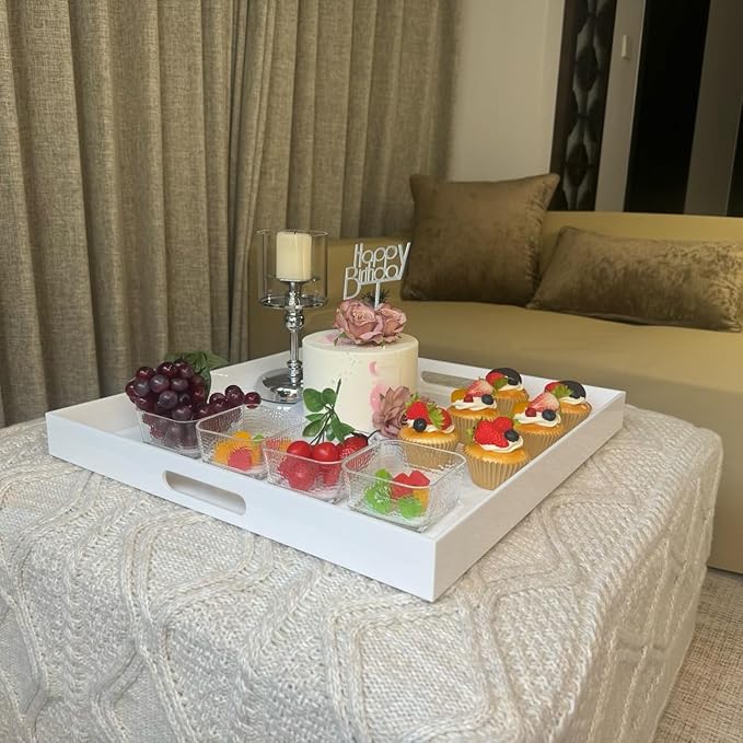 Glossy White 21"X21"X2" Decorative Tray Extra Large Sturdy Acrylic Serving Tray with Handles Countertop Organizer Tray for Ottoman Kitchen Bathroom Office Bar Decorative Tray -