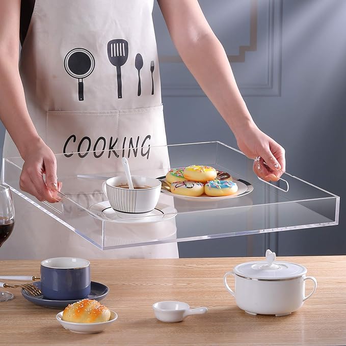 17 * 17 Acrylic Organizer Tray Large, Serving Tray with Handle, Lucite Tray Organizer for Bench, Coffee Table Countertop, Kitchen, Bathroom, Living Room, Powder Room -