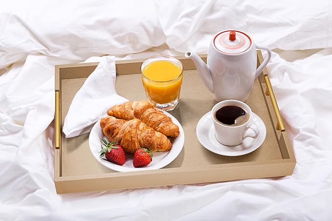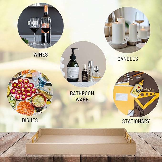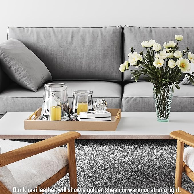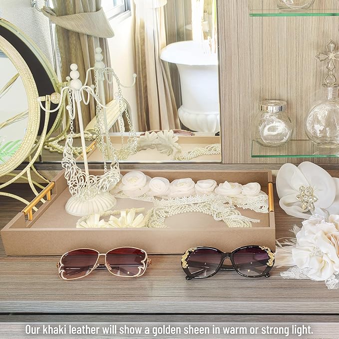 17" x 12" Wood Serving Tray with Gold Polished Metal Handles, Home Decorative Wooden Rectangle Ottoman Leather Decor Platter Bathroom Vanity Tray for All Occasions Khaki -