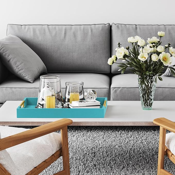 17" x 12" Wood Serving Tray with Gold Polished Metal Handles, Home Decorative Wooden Rectangle Ottoman Leather Decor Platter Bathroom Vanity Tray for All Occasions Blue -