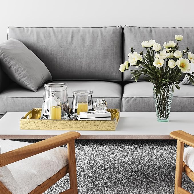 17" x 12" Wood Serving Tray with Gold Polished Metal Handles, Home Decorative Wooden Rectangle Ottoman Leather Decor Platter Bathroom Vanity Tray for All Occasions Alligator Gold -