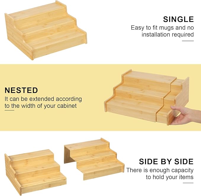 3-Tier Expandable Bamboo Mug Holder For Countertop Coffee Cup Holder Display Mug Organizer Mug Rack for Coffee Bar Organizer Mug Shelf for Cabinet for Kitchen, Home -