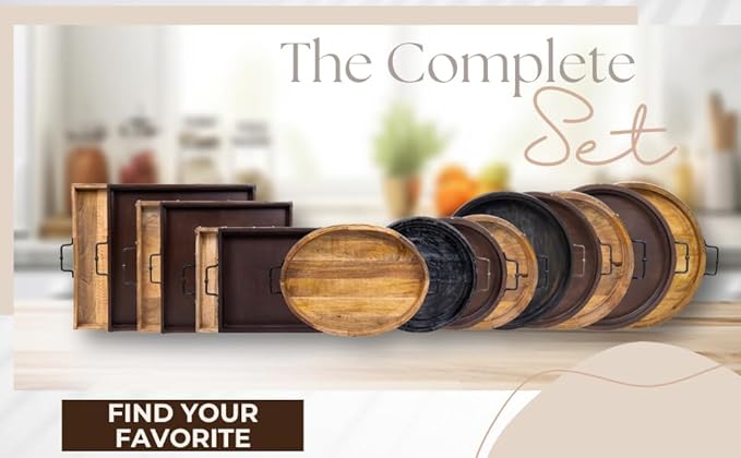 Acacia Wood Serving Tray - Set of 3 with Black Steel Handles 18", 16" & 14" with 6 Coasters - for Coffee Table, Ottoman in Living Room, Breakfast in Bed, Jewelry, Decorative (Vintage Finish) -