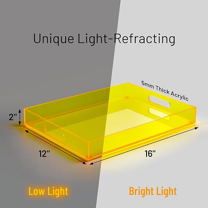 16"x12" Large Acrylic Serving Tray Decorative Ottoman Coffee Table Vanity Tray Tea Fruit Platter Snack Appetizer Dessert Drink with Handles for Bar Kitchen Party, Neon Yellow -