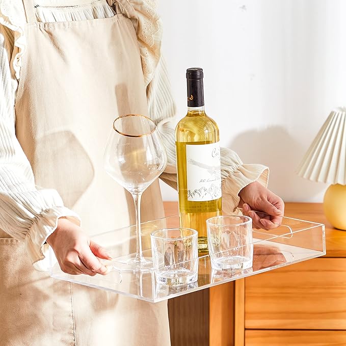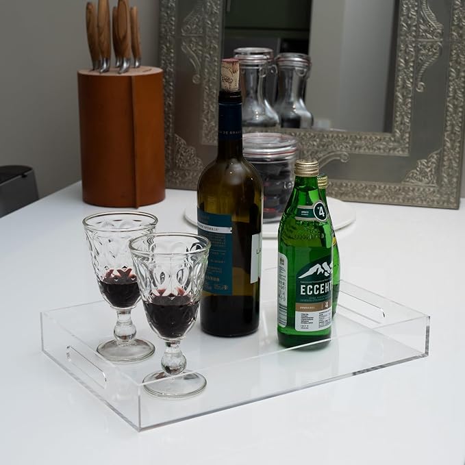 Clear Sturdy Acrylic Serving Tray with Handles 12x20x2H Inches -Spill Proof- Decorative Trays Countertop Organizer for Ottoman Coffee Table Nightstand, sidetable, Breakfast, Tea, Food -