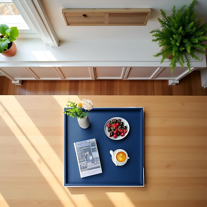 25 * 25 Inch Rectangular Ottoman Tray | Textured PU Leather, Waterproof & Heat-Resistant Storage for Coffee/Dining Tables, Sofa, Bed, Entertainment & Party (Navy Blue, 25 * 25in) -