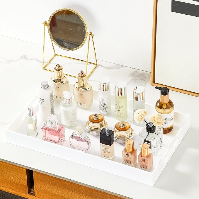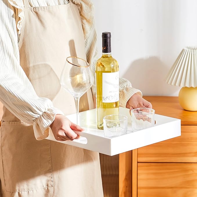 Glossy White Sturdy Acrylic Serving Tray with Handles 12x20x2H Inches -Spill Proof- Decorative Trays Countertop Organizer for Ottoman Coffee Table Nightstand, sidetable, Breakfast, Tea, Food -