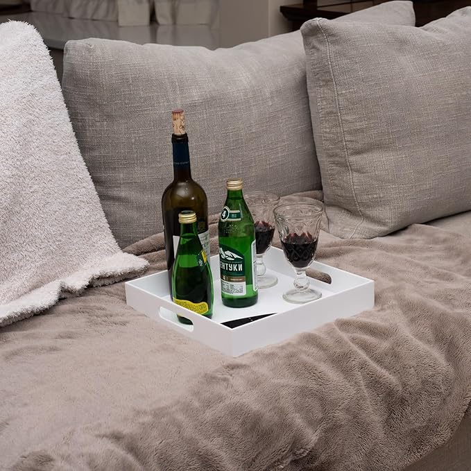 Glossy White Acrylic Serving Tray with Handles, 12x12x2H Inches - Spill Proof, Decorative Trays for Countertop, Ottoman Coffee Table, Nightstand, Breakfast, Tea, Food -