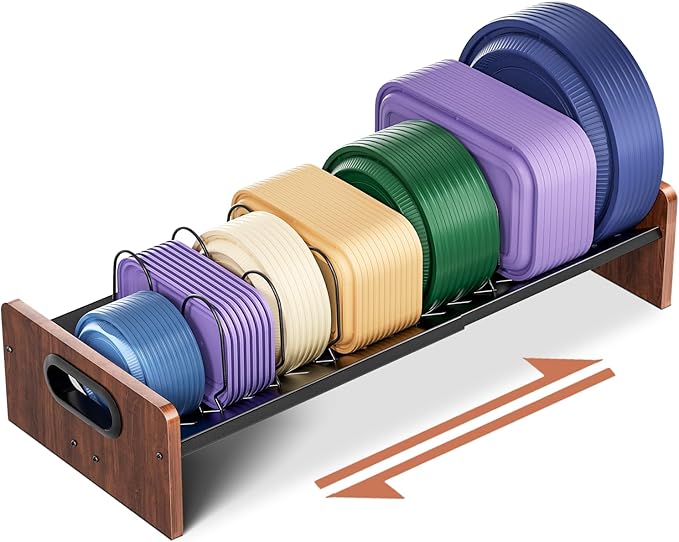 Expandable Food Container Lid Holder Organizer, Adjustable 13.97-22 Inch V-Shaped Kitchen Cabinet Storage Rack with 20 Slots & 6 Adjustable Dividers for Lids, Cutting Boards, Baking Pans -