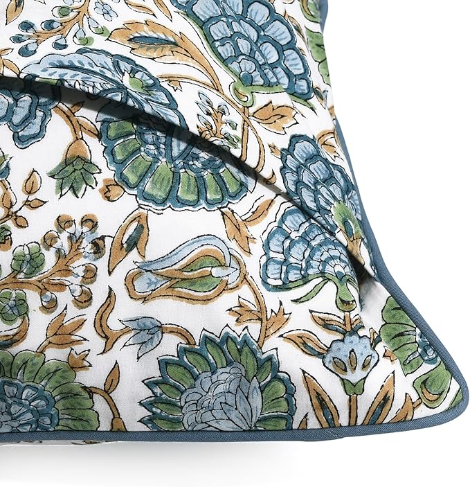 Ridhi Columbia Blue Block Print Cotton Throw Pillow Covers for Decorative Couch Pillows for Living Room, Chic Boho Cute Outdoor Valentine Pillows Covers Gifts 20x20 Inches -