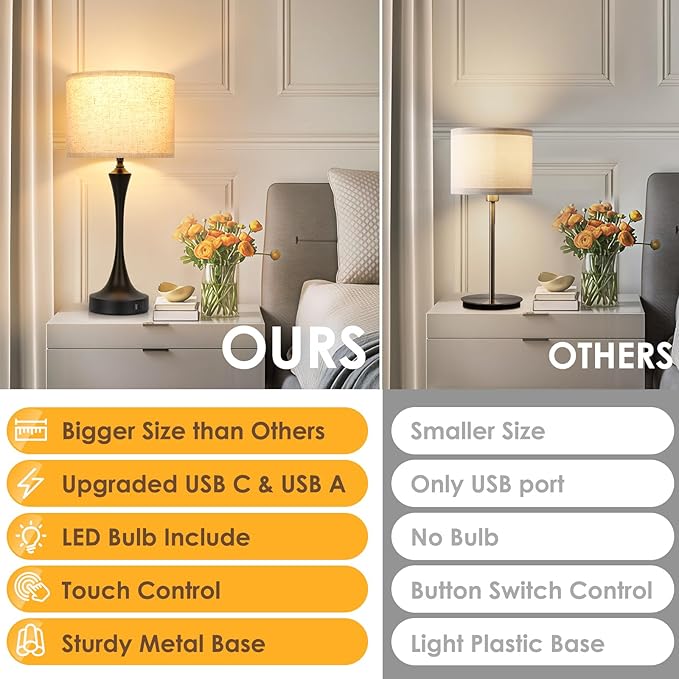 GGOYING 22” Set of 2 Touch Control Table Lamp with USB A+C Ports, 3-Level Dimmable Bedside Lamp with Fabric Lampshade, 3000K LED Bulbs, Nightstand Lamp for Bedroom Livingroom Office, Black -