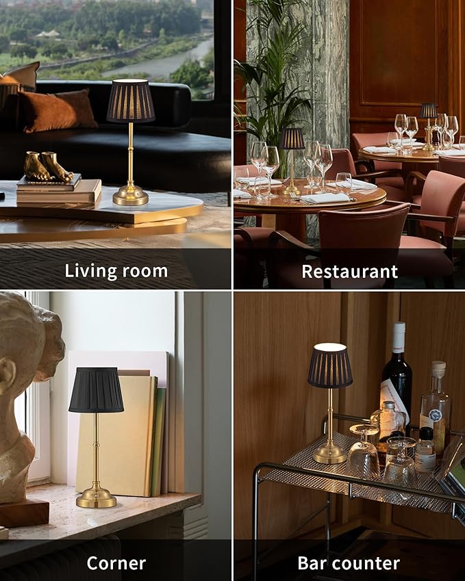 GGOYING Set of 2 Rechargeable Cordless LED Table Lamps, 4-Level Dimmer, Black Portable Desk Lamps with Black Fabric Shades, Night Light for Dining, Bedroom and Patio -