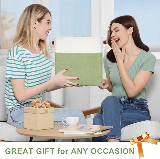 Large Fabric Storage Baskets | 50L Storage Bins, Decorative Linen Closet Baskets with Handles for Organizing, Shelf, Toys, Clothes, Home, Office, Nursery, 17x12x15Inches (Green&White) -