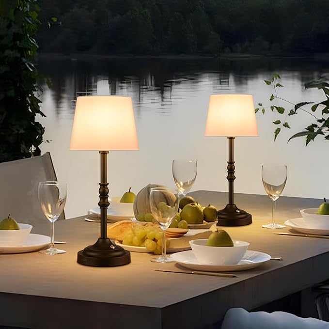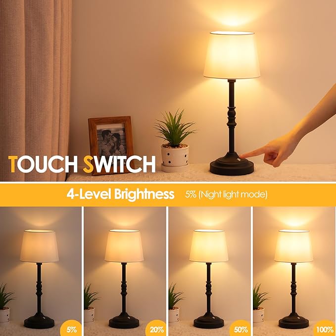GGOYING Set of 2 Rechargeable Cordless LED Table Lamps, 4-Level Dimmer, Black Portable Desk Lamps with White Fabric Shades, Night Light for Dining, Bedroom and Patio -
