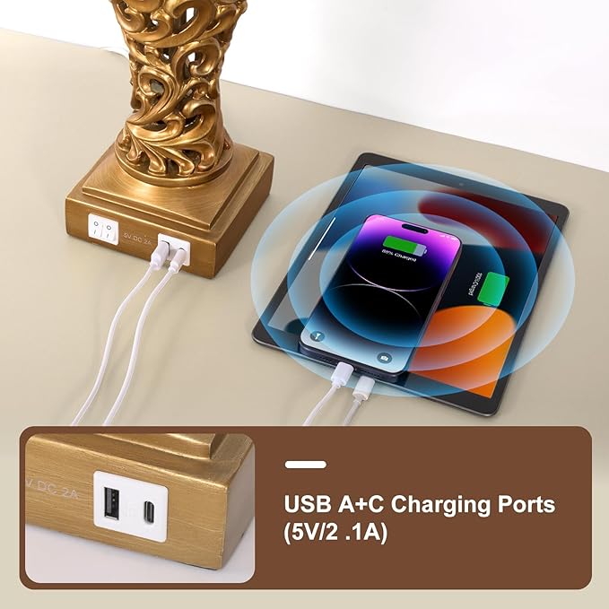 Vintage Table Lamps Set of 2, 28.5'' Tall Antique Gold Bedside Lamps with Fabric Shades, USB A+C Charging Ports & Night Light, Farmhouse Nightstand Lamps for Bedroom Living Room Office (Bulb Included) -