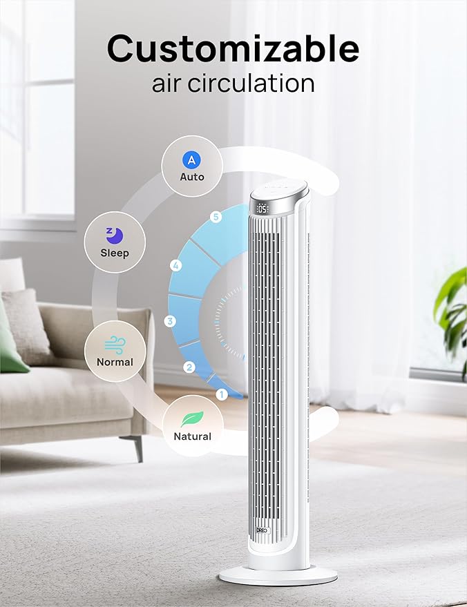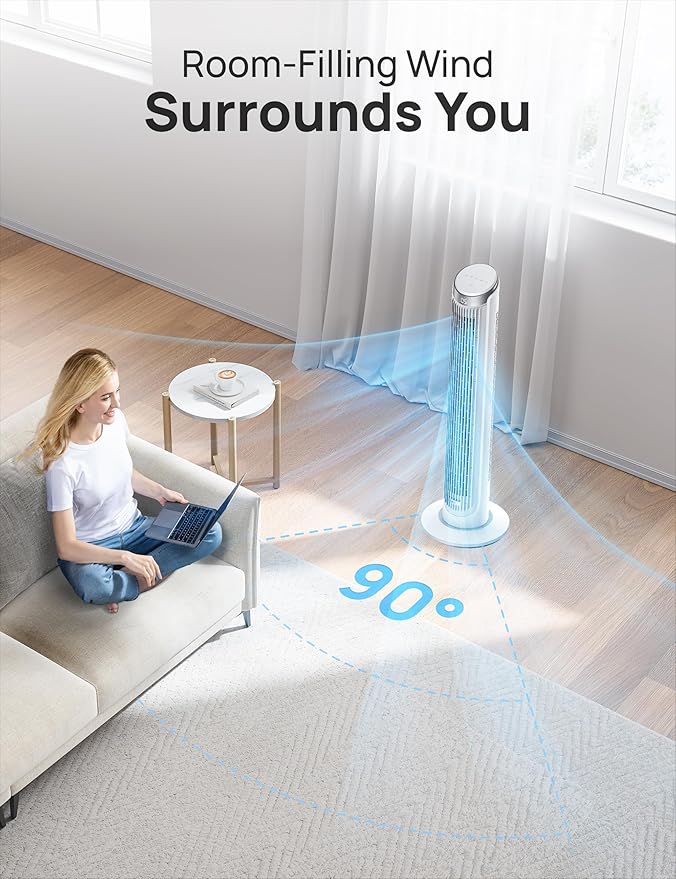 Dreo Tower Fans for Bedroom, 90°Oscillating Fans for indoors,5 Speeds 4 Modes Max 26ft/s, 12H Timer, LED Display with Touch, Remote, 40" Quiet Bladeless Standing Floor Fan for Home Office, White -