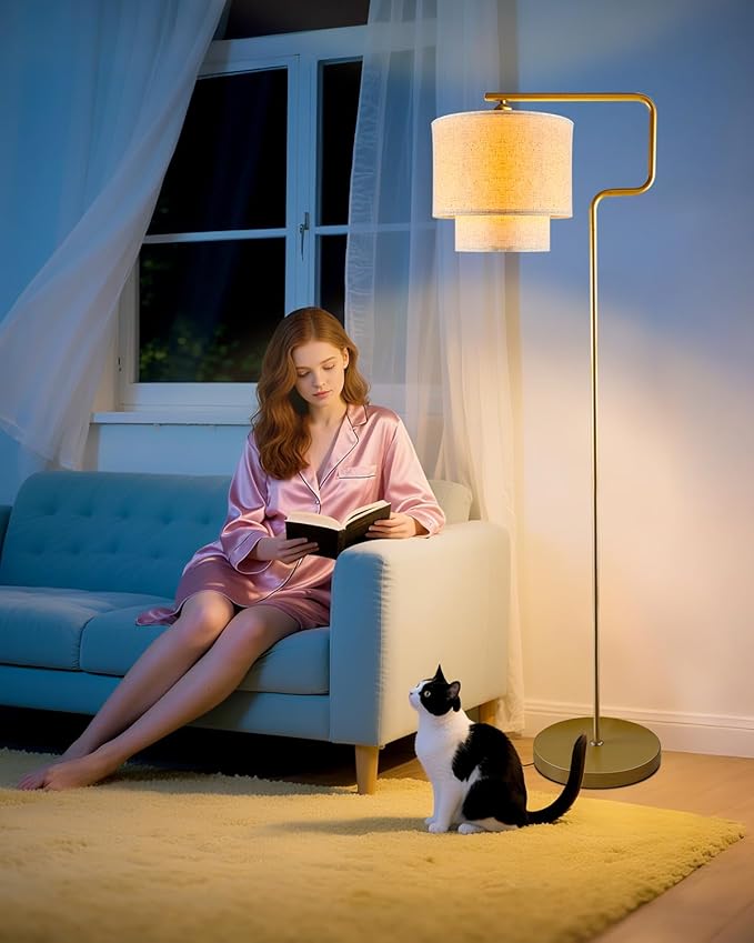 Lightdot 62IN Floor Lamps for Living Room, Modern Standing Tall Lamps with Double Linen Shades, 3000K Arc Bohemian Floor Lamp with Foot Switch for Wedding/Party, Bedroom, Home Office-Gold -