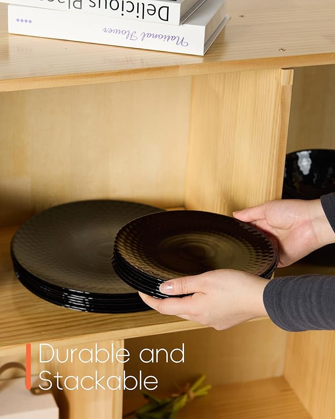 10.5 inch Dinner Plate Set of 6, Light and Durable Opal Glass Black Geometric Faceted Dinnerware Plates, Dishwasher and Microwave Safe -