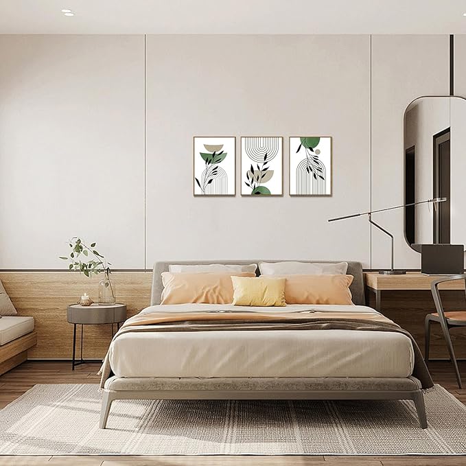 Bwodke Boho Wall Art, Framed Abstract Wall Art, Line Plants Leaf Canvas Wall Decor, Mid Century Sage Green Geometric Pictures Set of 3, Minimalist Paintings, for Bedroom Living Room Bathroom 12"x16" -