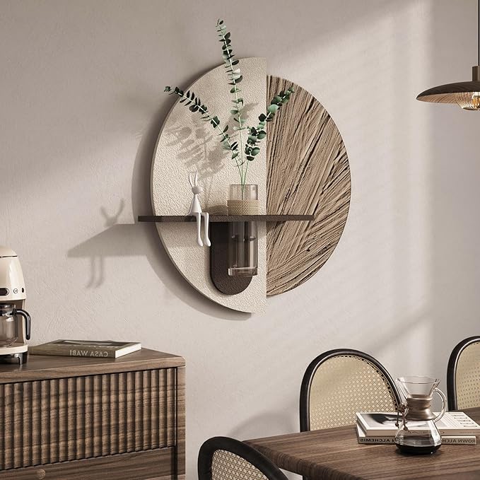 3D Textured Round Minimalist Wall Art with Vase, Neutral Wall Decor with Rabbit Sculpture, Abstract Geometric Artwork with Simulated Plants for Living Room Hallway Dining Room Bedroom Office, 31x24 In -