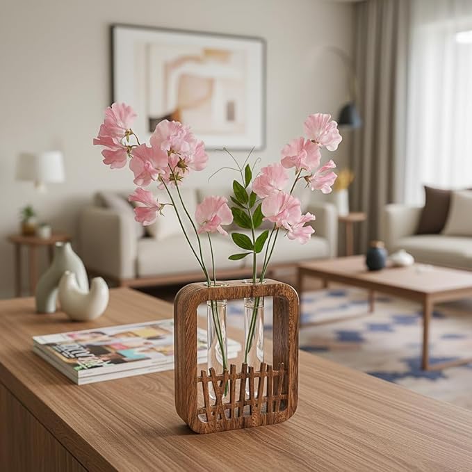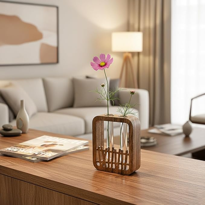 Walnut Wood Terrarium Planter - 2 Glass Test Tube Vase & Boho Plant Stand for Hydroponics, Home Office Desk Decor, Unique Housewarming Birthday Gifts for Women Plant Lovers -