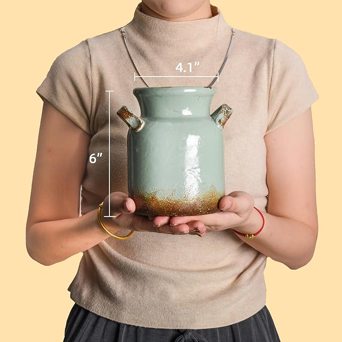 Ceramic Rustic Distressed Green Flower Vase for Centerpieces, Kitchen, Office or Living Room (5.9''x6.3'') -