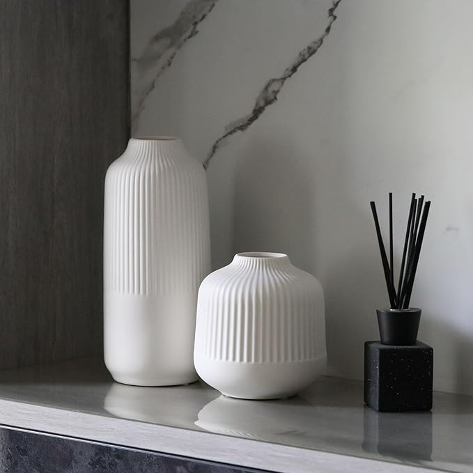 White Ribbed Ceramic Vase – Modern Elegant Flower Vase for Pampas Grass, Fresh or Dried Flowers, Minimalist Farmhouse Home Decor for Living Room, Dining Table, Wedding Centerpiece -