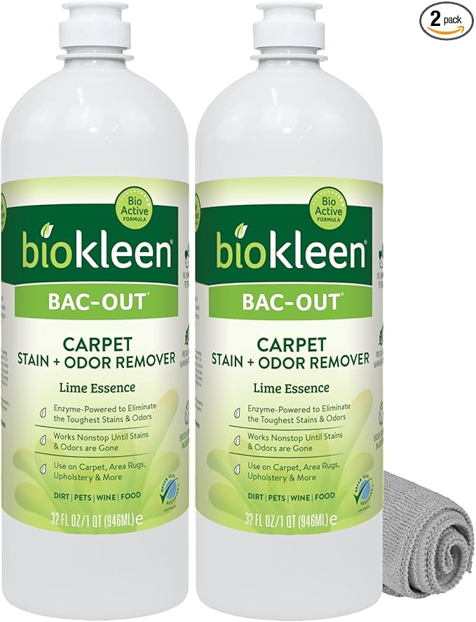 Biokleen Bac-Out Enzymatic Stain & Odor Remover for Carpet - Removes Stains and odors caused by dirt, pet accidents, wine, food, smoke - 2 Pack 32 oz w/Micro Cleaning Towel