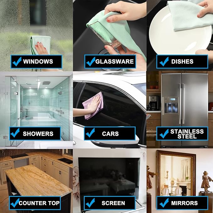 • Streak-free lint-free: Microfiber Glass Scrubbing cloth are best for cleaning & polishing glass windows mirrors car windshield dishes wine glassware bath shower door and stainless steel,eyeglass lens,Computre. Unique fish scale wave can catch dust dirt easily remove smudges water spots fingerprints fast. Easyclean lintfree rag.