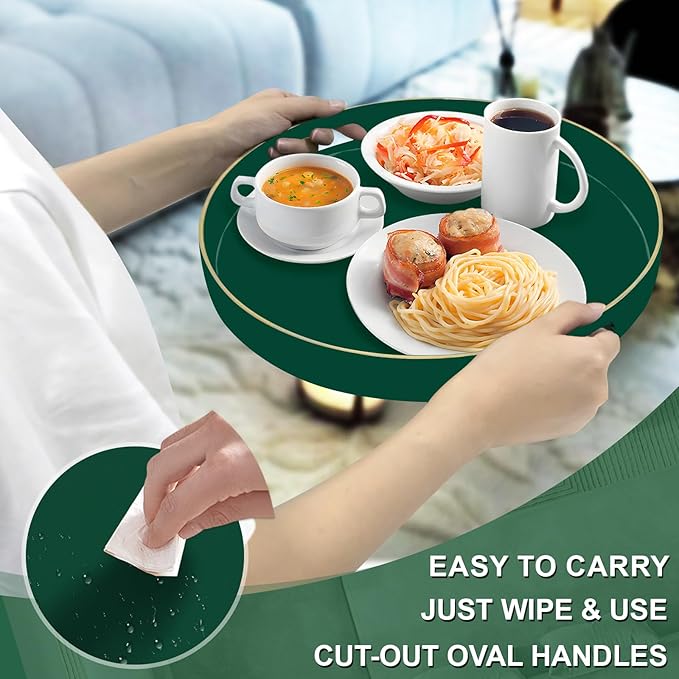 • LIGHTWEIGHT: Decorative serving tray is made of high-quality plastic, durability and lightweight. Green round tray with built-in oval handles that are comfortable to grip and carry while avoiding any strain on your fingers. The serving tray for ottoman has surrounding 1.6" tray lips that prevent items from falling over.