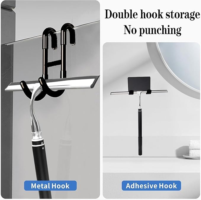 • 【Easy to Store】The window squeegee with extension pole comes with 2 wall-mounted hooks, no need to drill holes, you can hang it on the shower glass, or hang it on the wall, or any other place you want to store it, which can minimize the floor space and convenient to use